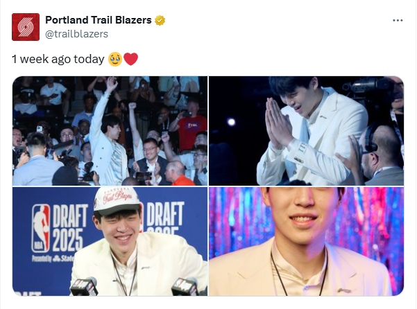 第16顺位!开拓者官推晒杨瀚森被选中帅照:一周前的今天🥹❤️